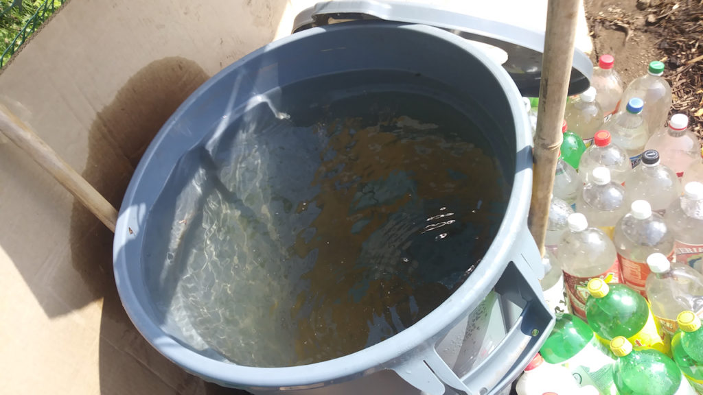Now i wish i would have installed a second one to catch the run-off. All those bottles on the ground represent what has to be hauled every time we water. We use two liter bottles because they are pretty portable, free, and it forces us to target where we put our water. Every drop counts and we would rather water the plants, not the walkways.