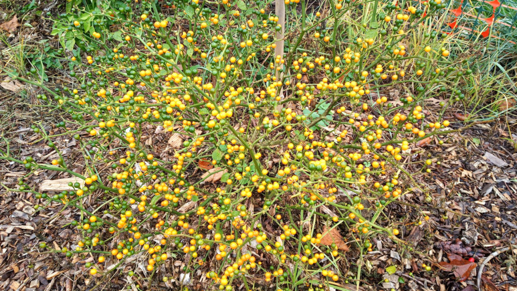 After rounding up the remaining Gang of 9, we harvested our experimental peppers. The Charpita (world’s most expensive pepper), is a beautiful bush with its small, green leaves and bright orange berries. Its also the world’s most PIA to pic. The stems are VERY attached to the pepper and extremely long relative to the pod itself. Its a pain to harvest, a pain to clean, but boy are they tasty. Similar to mini habaneros, with a bit of sweet to them as well.