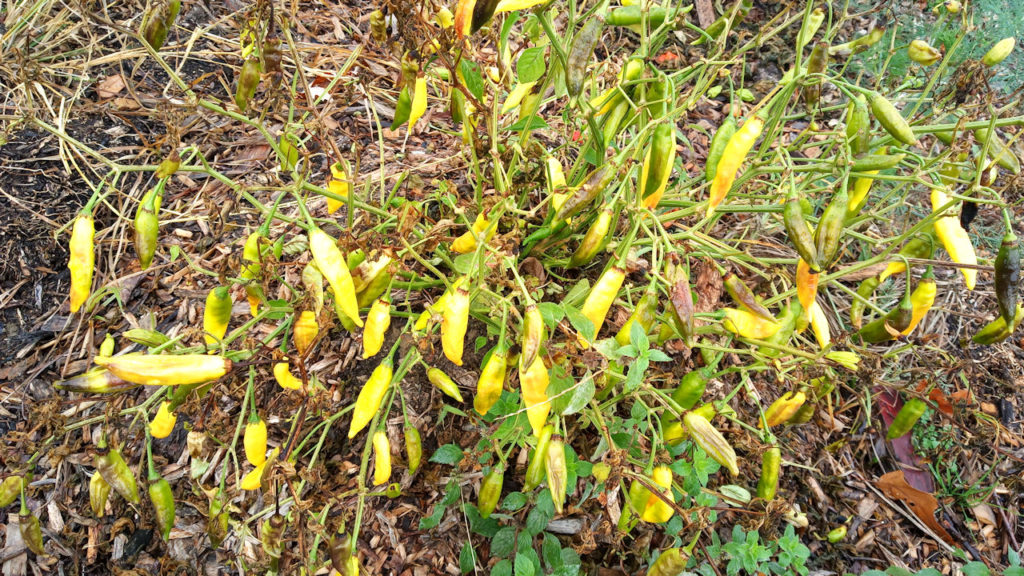 First thing’s first. We hit up each bush, looking for the best peppers left. Its actually a lot easier picking after a frost-there aren’t so many leaves in the way. It does do a lot of harm to the plant. It could come back if it suddenly became spring, but that’s not going to happen. Since the photoperiod has changed and the sun has red-shifted (moving away from us), they are going through their final stages of life and will die. That, unfortunately, does not speed up the ripening process.