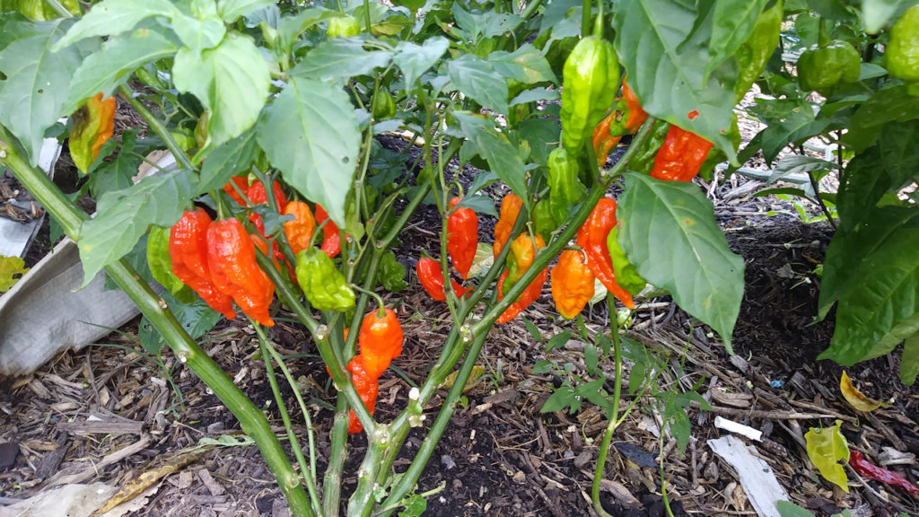 We don’t kill spiders. The wood chips make for perfect hideouts for ambush spiders. They are everywhere, carrying their little egg sacs with them. When we see a large web between two plants, we go around. Our favorite is the Corset Spider. The black skulls on the yellow body and that special thing they do with their webs right down the middle is really unique.