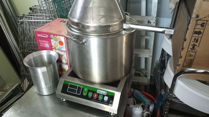 Shown here is a heavy duty induction burner, stainless steel stockpot, cone filter, a blender, and alluminum messuring pitcher.